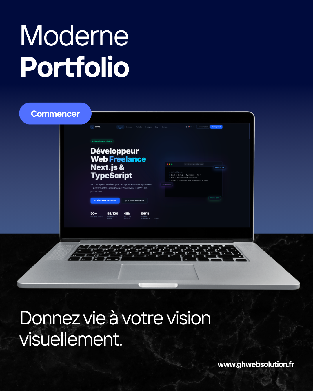 Plateforme SaaS complète pour mon activité de freelance : site vitrine ultra-rapide, espace client sécurisé, chat temps réel et gestion automatique de la facturation.
